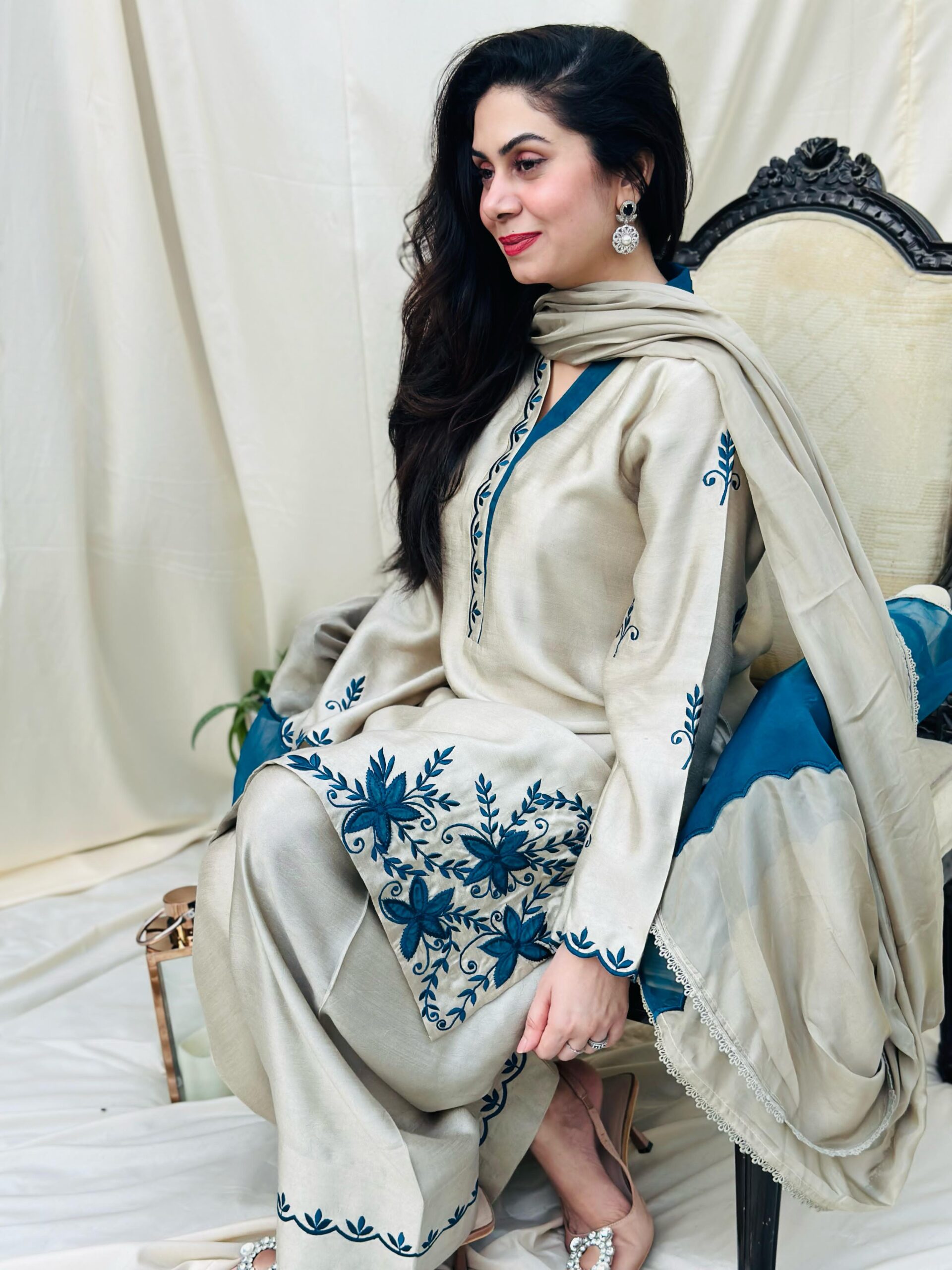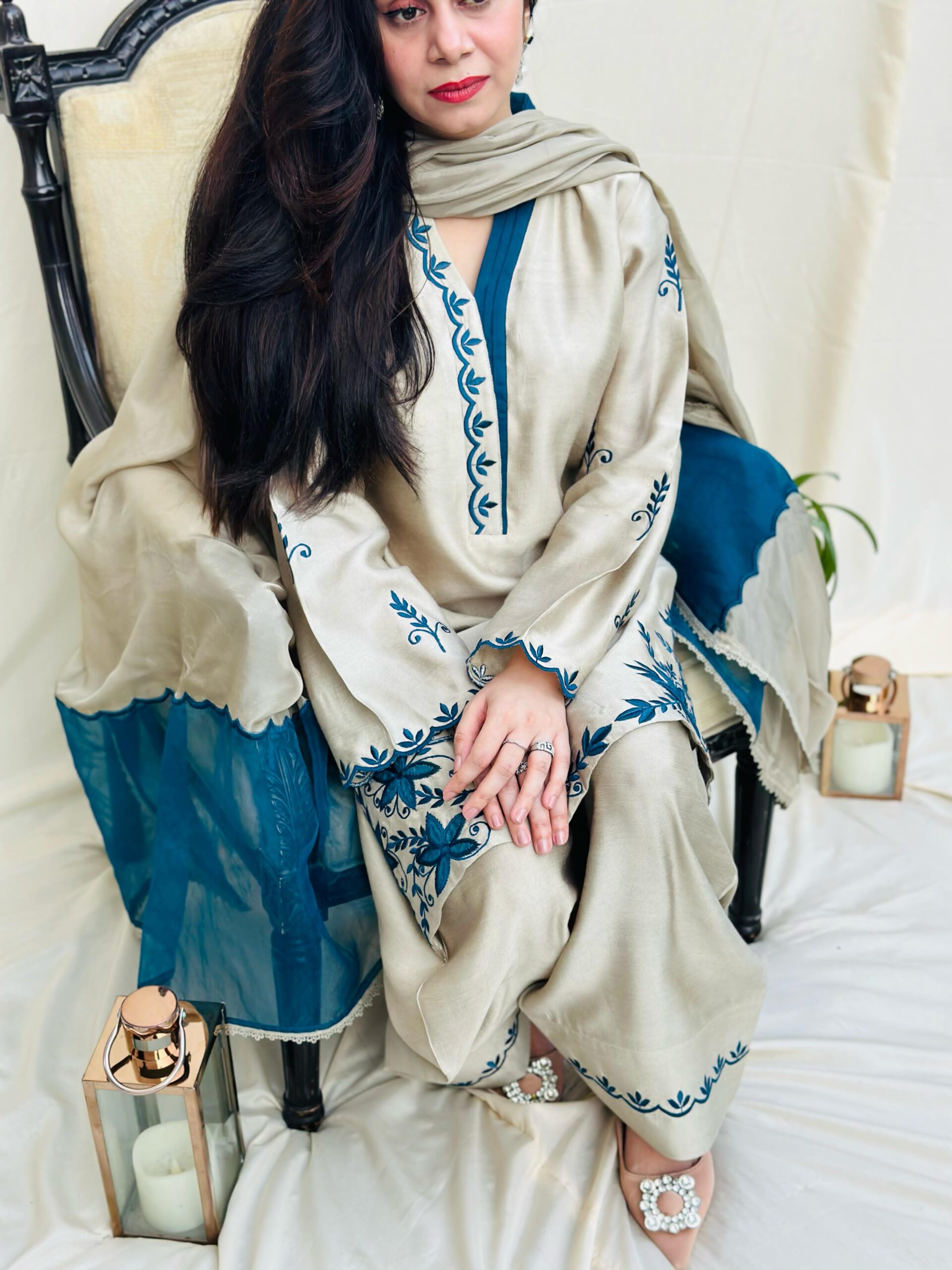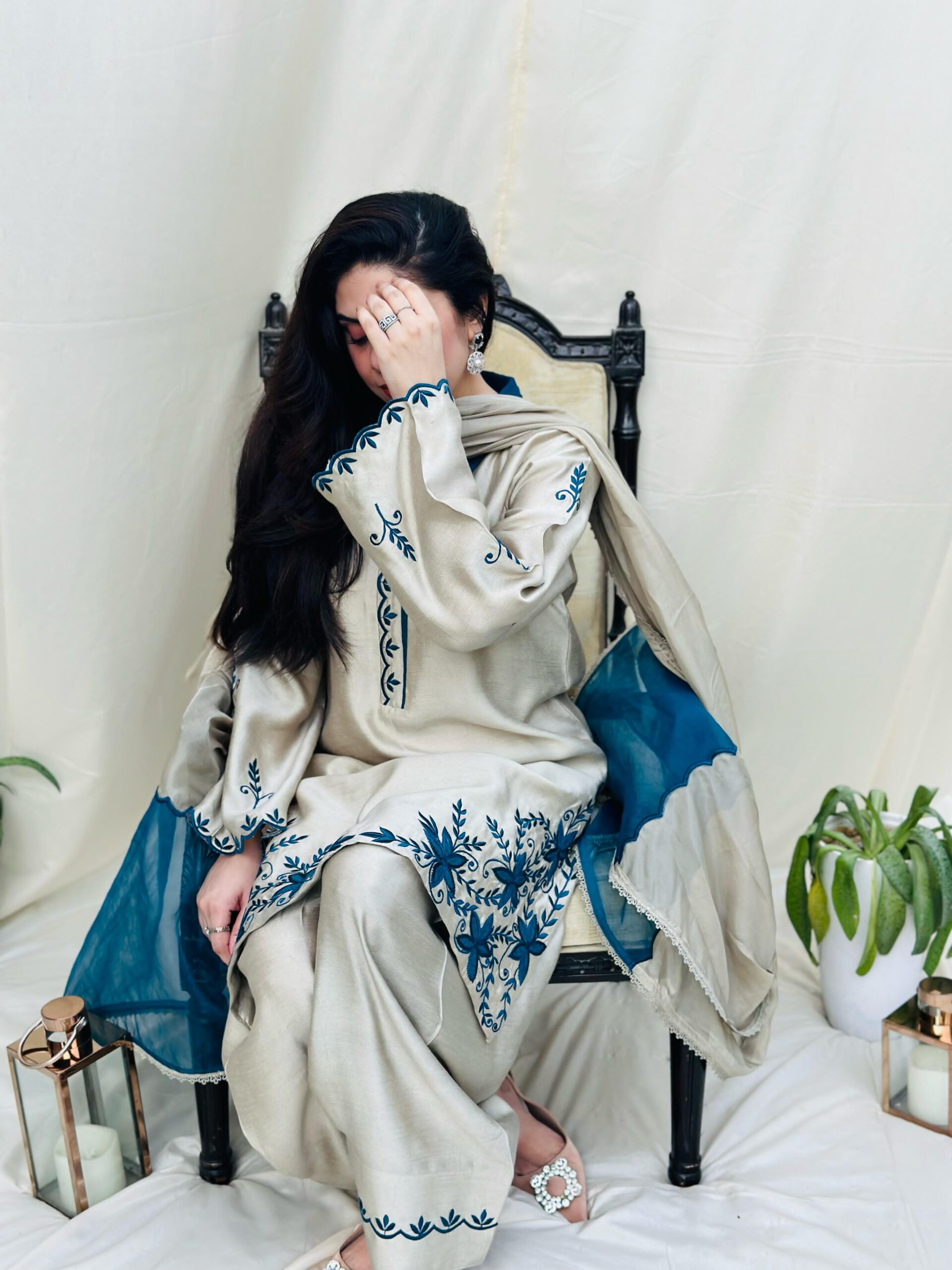 This outfit consists of a light siege green pure sheesha cotton silk top with teal green resham work, paired with a farshi shalwar and a medium silk duppata featuring an organza border.